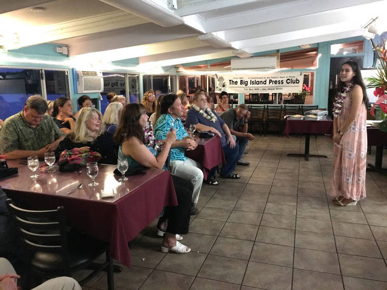 BARON SEKIYA/Big Island Press Club Emily Tsuji, winner of the Big Island Press Club’s $1,000 Hugh Clark Memorial Scholarship, thanks club members during its annual scholarship dinner May 9 at Seaside Restaurant in Hilo. Tsuji, a 2019 graduate of Waiakea High School, will study film and electronic arts at California State University, Long Beach.