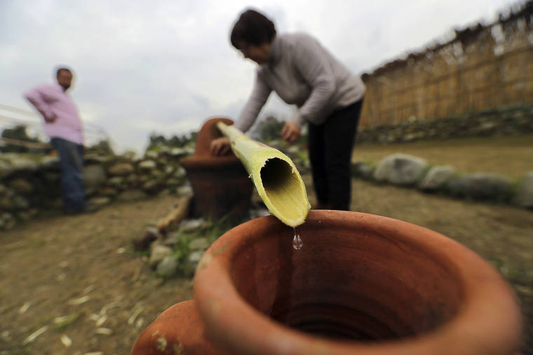 In this photo taken on Saturday, April 4, 2019, drops of perfume made from Cypriot herbs trickle from a bamboo reed after being distilled through a boiling method used thousands of years ago, at an ancient perfume theme park and museum in Korakou, Cyprus. Even before gaining fame in antiquity as the birthplace of the love goddess Aphrodite 2,700 years ago, sun-drenched Cyprus had made a name for itself for the superior quality of its perfumes that it’s said were even prized by the mighty queens of Egypt. (AP Photo/Petros Karadjias)