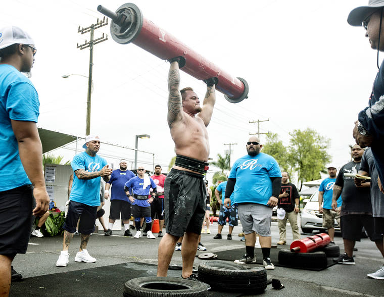 He works out six times a week, about two or three hours a day when not working his construction job, in preparation for the Hawaii Strongman competition June 8 in Kona, an event that can send winners to mainland competitions where sponsors will be waiting to spot new talent deserving of sponsorship.