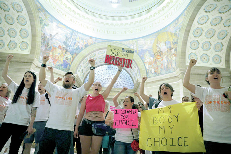 Abortion-rights supporters in the House chanted, “when you lie, people die” and “women’s rights are human rights” during debate on the measure before being escorted from the chamber. Outside, they shouted “shame, shame, shame” after lawmakers voted 110-44 to pass it.