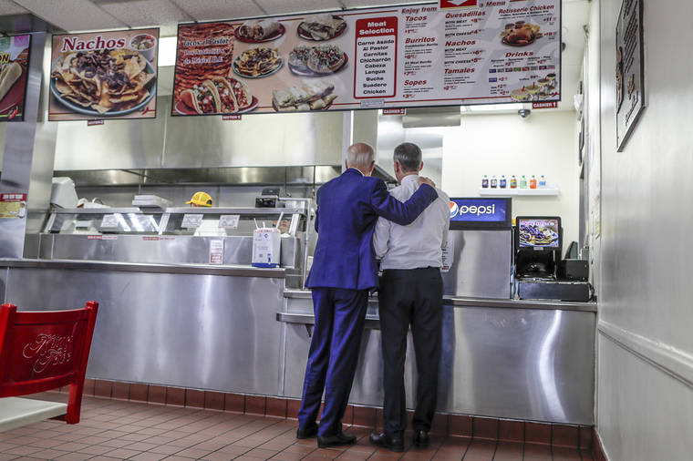 Robert Gauthier/Los Angeles Times/TNS Presidential candidate Joe Biden and Los Angeles Mayor Eric Garrett order tacos May 8 as they visit a King Taco in Los Angeles.