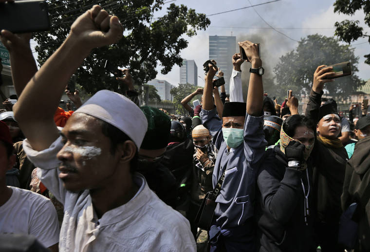 White-robed men blocked streets in one central Jakarta neighborhood and in another, rioters fought running battles with police, throwing rocks and setting fires.
