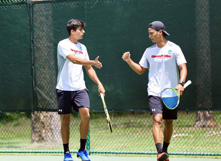 SHELLY BLUNCK/UHH UH-Hilo’s Alessandro Giuliato, left, and Chun En Wu won their doubles match Tuesday at the NCAA Division II championships, and they each went on to win in singles in straight sets as the Vulcans beat Bluefield State 4-0.
