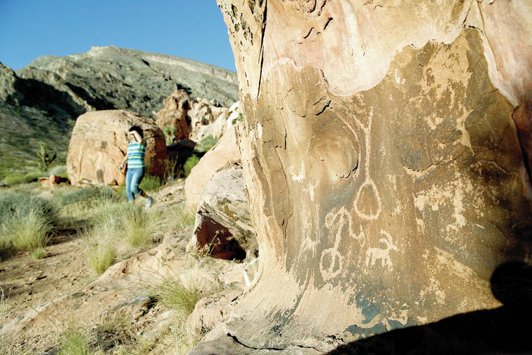 FILE - In this May 26, 2017, photo, Susie Gelbart walks near petroglyphs at the Gold Butte National Monument near Bunkerville, Nev. U.S. Interior Secretary David Bernhardt says he has no plans for additional changes to Gold Butte and other national monuments as recommended by his predecessor, but says it’s ultimately up to President Donald Trump. (AP Photo/John Locher, File)