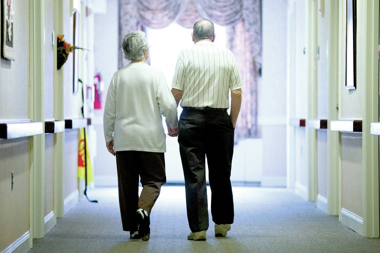 FILE - In this Nov. 6, 2015 file photo, an elderly couple walks down a hall of a nursing home in Easton, Pa. Research released on Tuesday, June 4, 2019 shows fatal falls have nearly tripled in older Americans in recent years, rising to more than 25,000 deaths yearly. (AP Photo/Matt Rourke, File)