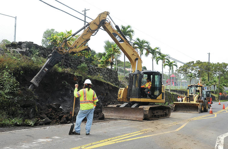 LAURA RUMINSKI/West Hawaii Today County employees perform shoulder improvements on Mamalahoa Highway in front of Holualoa Elementary School. Council members struck a deal with the Finance Department for up to $5.5 million in bonding for each council member to use for road projects in his or her district.