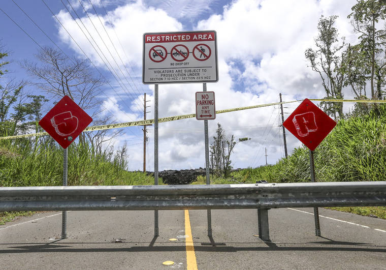 HOLLYN JOHNSON/Tribune-Herald Signs inform visitors that the area is restricted where the lava crosses Highway 132 in Pahoa.