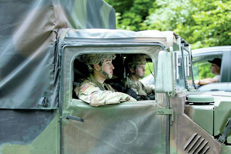 West Point cadets drive along Route 293 near the site where a light medium tactical vehicle overturned, Thursday, June 6, 2019. West Point officials say one cadet was killed and over a dozen people were injured when the vehicle they were riding in for summer training overturned. The accident occurred near Camp Natural Bridge. (AP Photo/Allyse Pulliam)