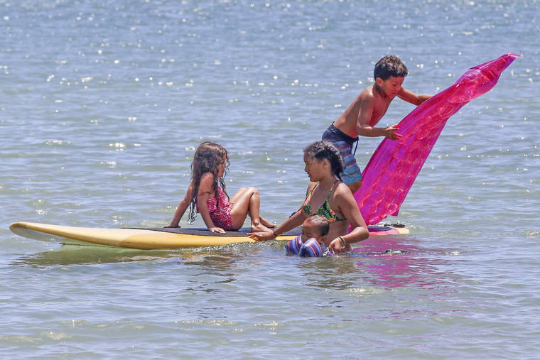 HOLLYN JOHNSON/Tribune-Herald From left, siblings Preslynn, 5, Piercetin, 1, Mylee, 11, and Paxtin Goodhue-Souza, 7, play in the ocean Friday at Reeds Bay Beach Park in Hilo. A drier than normal spring puts E. Hawaii well behind it average rainfall totals heading into summer.