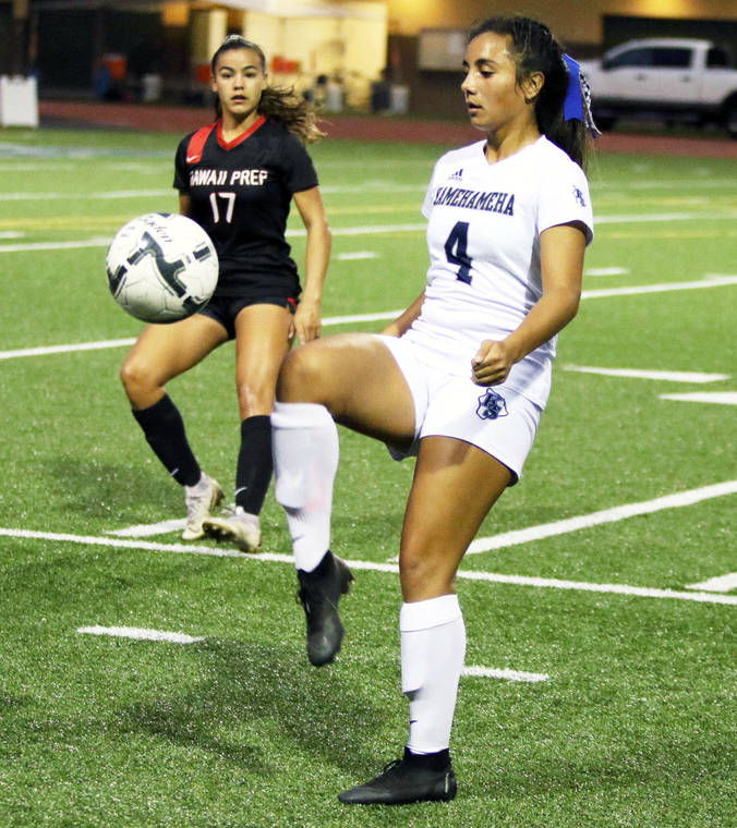 TIM WRIGHT/Tribune-Herald While Malia Brost, background, and Hawaii Prep had the final say at the state tournament, it was Kamehameha’s Kaila Ambrosio who made an indelible impact on the BIIF championship. Ambrosio scored a memorable equalizer and is the Player of the Year.