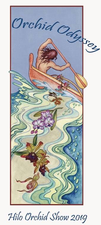 Hilo Orchid Society president Dana Culleney showed off the artwork for the show, featuring a Hawaiian voyager with orchids trailing behind his canoe.