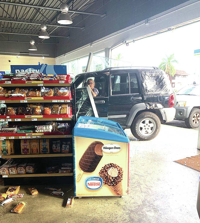“I heard a big crashing sound and thought it was an earthquake,” said Aloha Island Mart employee Alina Jerilong, who was behind the register when the crash occurred. “Then there was a car in here, things flying everywhere and glass all over the ground.”