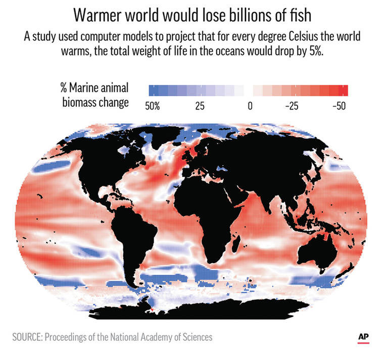 “We will see a large decrease in the biomass of the oceans,” if the world doesn’t slow climate change, said study co-author William Cheung, a marine ecologist at the University of British Columbia. “There are already changes that have been observed.”
