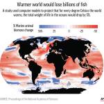 Every degree Celsius (1.8 degrees Fahrenheit) that the world’s oceans warm, the total mass of sea animals is projected to drop by 5%, according to a comprehensive computer-based study by an international team of marine biologists. And that does not include effects of fishing.