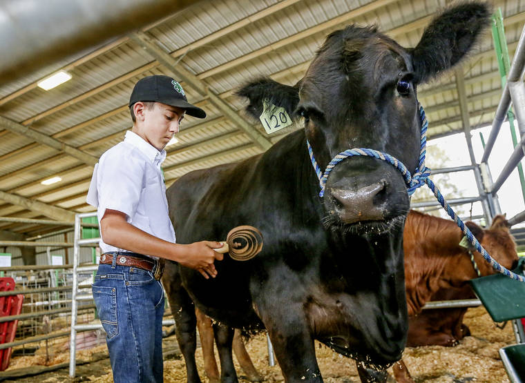 Owen Flores, 12, of Ka‘u 4-H Livestock Club brushes his market steer, Dezi, on Friday during the Hawaii County 4-H Livestock Show and Sale in Anderson Arena at Rocking Chair Ranch in Honokaa. The show and sale continues today at 8:30 a.m. The schedule for today’s events includes the lamb show at 8:30 a.m., hog show at 9:30 a.m., steer show at 11 a.m. and the auction at 2 p.m. To see more photos from the event, see Monday’s edition of the Hawaii Tribune-Herald.