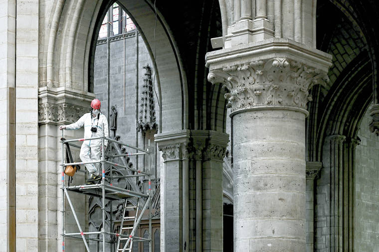 FILE - In this May 15, 2019 file photo, a worker stands on scaffolding during preliminary work inside the Notre Dame de Paris Cathedral, in Paris. The billionaire French donors that publicly promised flashy donations totalling hundreds of millions to restore Notre Dame, have not yet paid a penny toward the restoration of the French national monument, according to church and business officials. Instead, it’s mainly American citizens that have footed the bills and paid salaries for the up to 150 workers employed by the cathedral since the April 15 fire. (Philippe Lopez/Pool via AP, File)