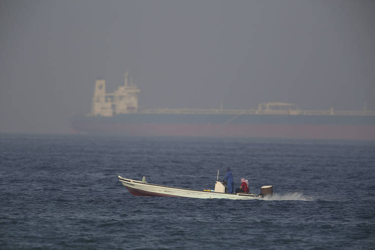 A fishing boat speeds past an oil tanker in the distance in Fujairah, United Arab Emirates, Saturday, June 15, 2019. The Kokuka Courageous, one of two oil tankers targeted in an apparent attack in the Gulf of Oman, was brought to the United Arab Emirates’ eastern coast Saturday. (AP Photo/Jon Gambrell)