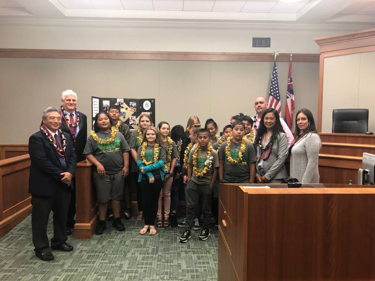 Courtesy photo Congratulating the Keaau Middle School students are, left, 3rd Circuit Chief Judge Greg Nakamura and Hawaii Chief Justice Mark E. Recktenwald and, right, 3rd Circuit District Family Court Judge Darien Nagata (wearing lei), counselor Krissy Bajo, and, back right, Chad Keone Farias, Ka’u-Keaau-Pahoa Complex Area superintendent.