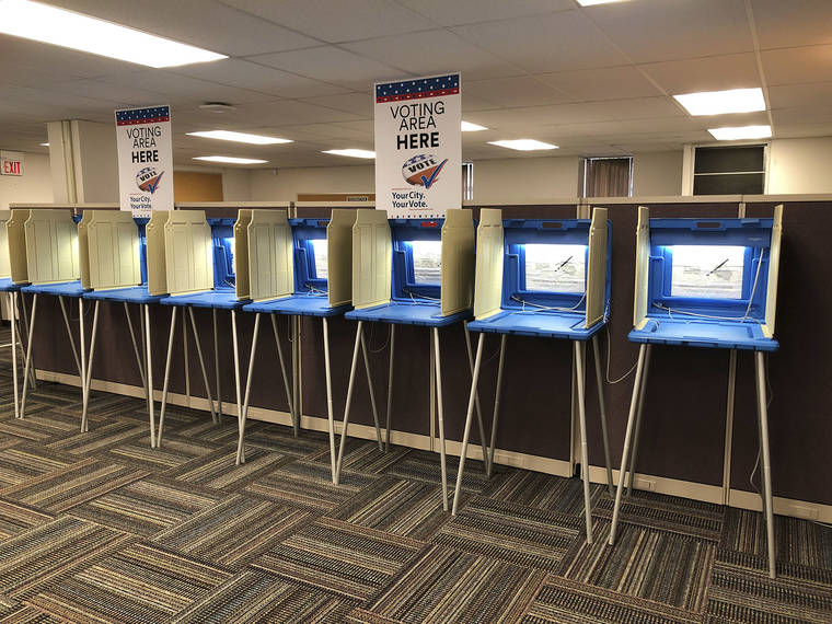 In this Sept. 20, 2018 photo, voting booths stand ready in downtown Minneapolis for the opening of early voting in Minnesota. A majority of Americans are concerned that a foreign government might interfere in some way in the 2020 presidential election, whether by tampering with election results, stealing information or by influencing candidates or voter opinion, a new poll shows.(AP Photo/Steve Karnowski)