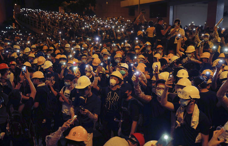 Protesters hold up their mobile phone lights as they surround the police headquarters in Hong Kong on Friday, June 21, 2019. Several hundred mainly student protesters gathered outside Hong Kong government offices Friday morning, with some blocking traffic on a major thoroughfare, after a deadline passed for meeting their demands related to controversial extradition legislation that many see as eroding the territory’s judicial independence. (AP Photo/Kin Cheung)