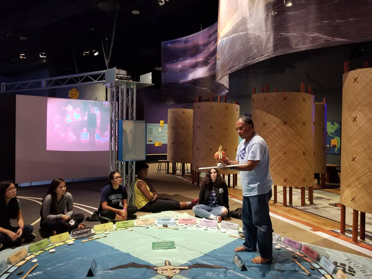 With a mat representing a star compass spread out on the floor, Kalepa Baybayan, ‘Imiloa’s navigator in residence, spoke to the group about oceanic navigation.