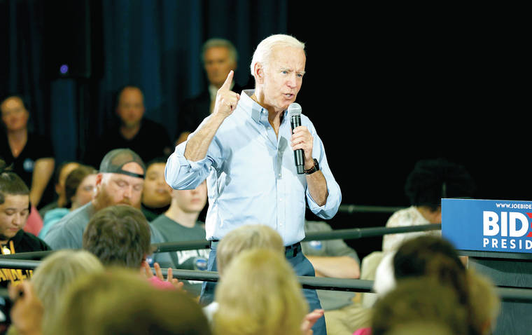 FILE - In this June 12, 2019, file photo, Democratic presidential candidate former Vice President Joe Biden speaks at Clinton Community College in Clinton, Iowa. Biden has sat atop the crowded Democratic presidential field from virtually the moment he joined the race. But his recent fumbles on abortion and race are a reminder that early front-runners often face the most intense scrutiny. (AP Photo/Charlie Neibergall, File)