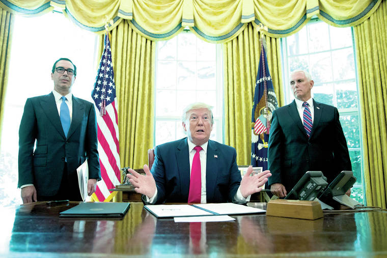 President Donald Trump listens to a reporter’s question after signing an executive order to increase sanctions on Iran, in the Oval Office of the White House, Monday, June 24, 2019, in Washington. Trump is accompanied by Treasury Secretary Steve Mnuchin, left, and Vice President Mike Pence. (AP Photo/Alex Brandon)
