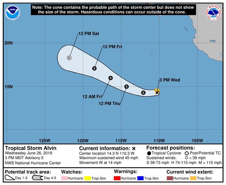 Alvin is projected to slowly strengthen through Thursday, then to start weakening on Friday and become a remnant low pressure system on Saturday, with no effect on Hawaii weather.