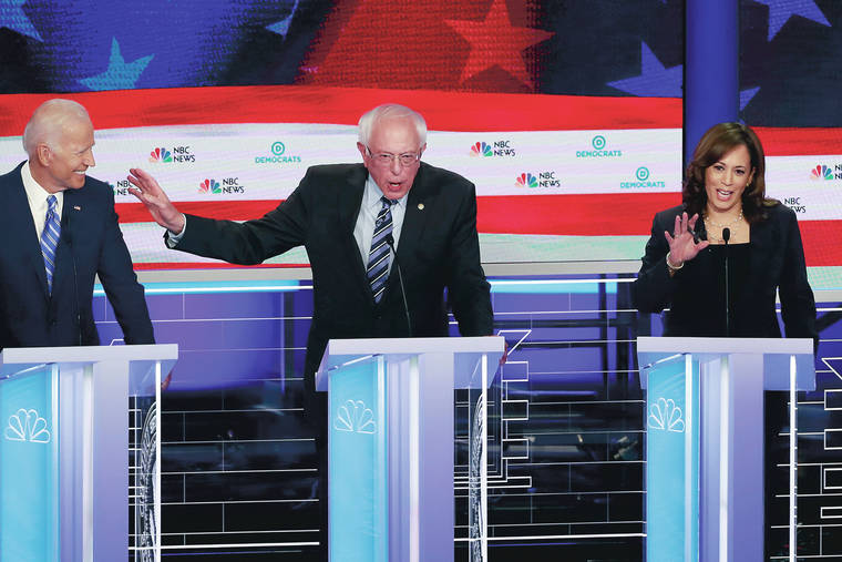 Democratic presidential candidate Sen. Bernie Sanders, I-Vt., center, gestures towards former vice president Joe Biden, as Sen. Kamala Harris, D-Calif., talks Thursday during the Democratic primary debate in Miami. (AP Photo/Wilfredo Lee)