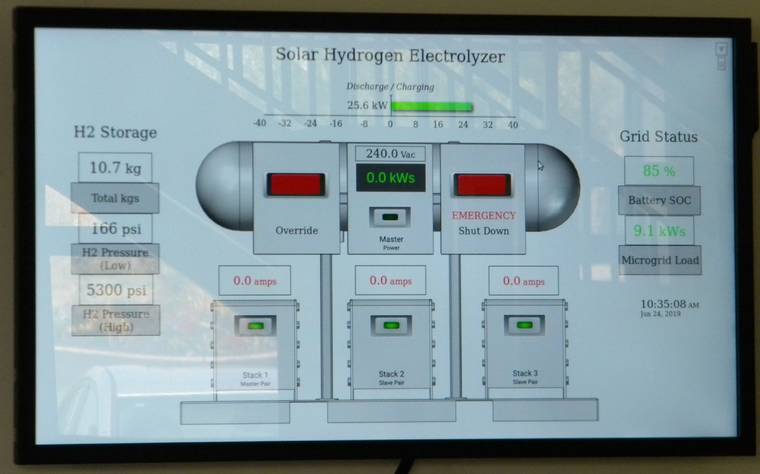 Hydrogen to run the vehicles, to store the energy harnessed by the solar panels, to power the community water system, to create jobs, to cook the food. And to power the county’s Hele-On bus system.