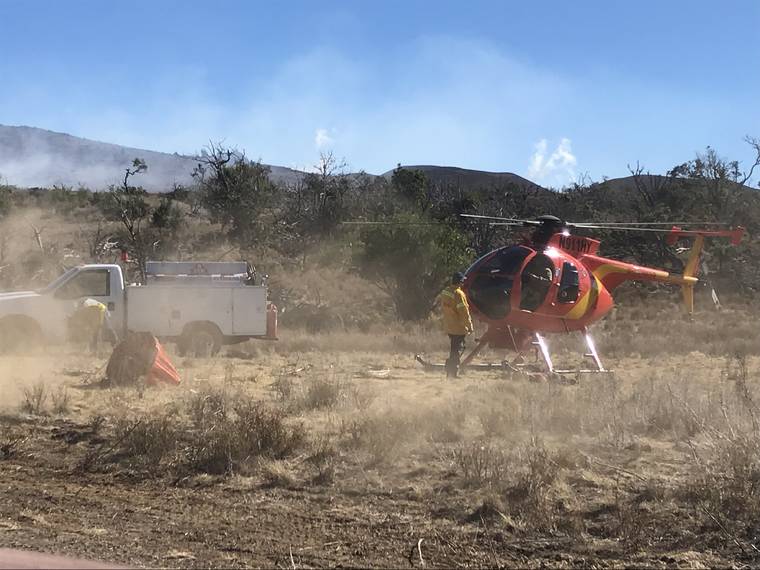 Photo courtesy of POHAKULOA TRAINING AREA A Hawaii County helicopter prepares to lift off to conduct water drops Feb. 6 on the slopes of Maunakea.