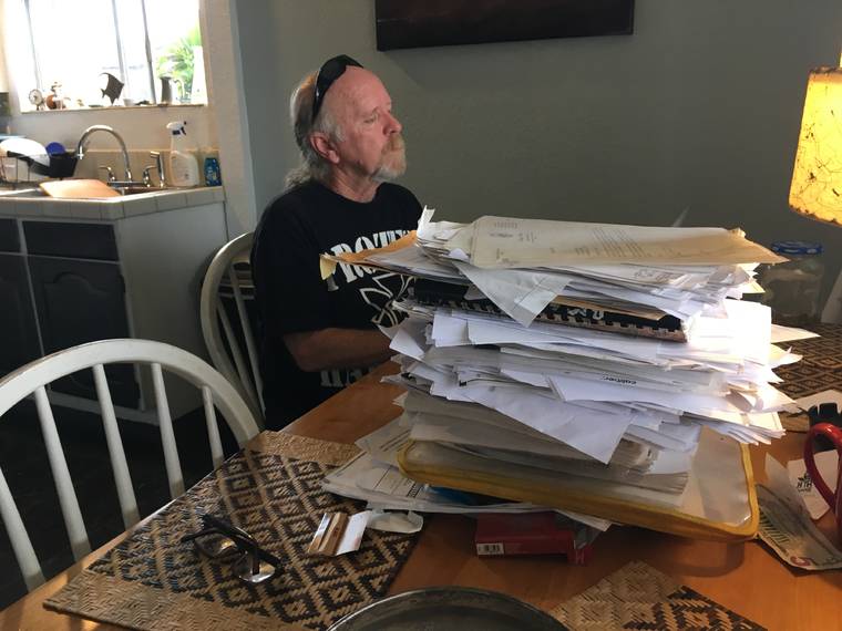 CAMERON MICULKA/West Hawaii Today Ron Cawthon sits next to documents related to his push to get the county to implement preservation recommendations and actions at Laaloa Beach Park outlined in a 1997 preservation plan and 2006 burial treatment plan.