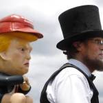 Protesters objecting to what they saw as his co-opting of the holiday inflated a roly-poly balloon depicting Trump as an angry, diaper-clad baby.