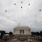 A late afternoon downpour drenched the capital’s Independence Day crowds and Trump’s speech unfolded in occasional rain. The warplanes and presidential aircraft he had summoned conducted their flyovers as planned, capped by the Navy Blue Angels aerobatics team.