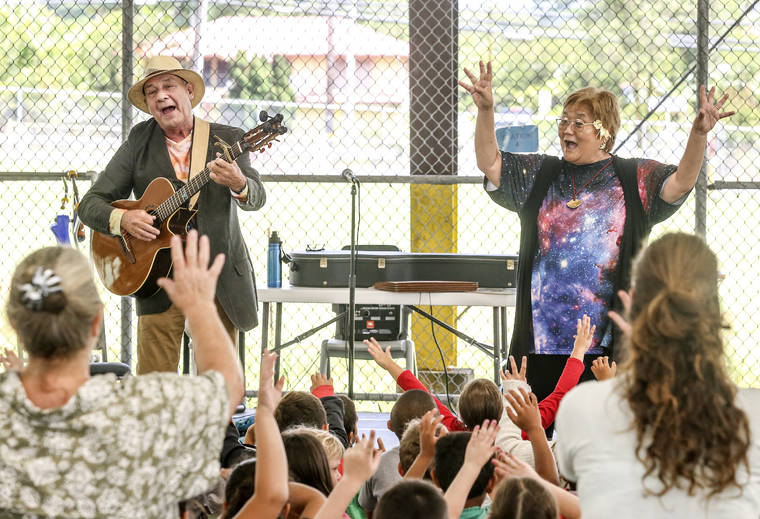 Musician “Gentleman Jeff” Babb and storyteller “Aunty Nyla” Fujii-Babb perform participatory stories and songs for keiki during their show “Sky Tales” on June 19 in the play court at Mountain View Elementary School. The event was sponsored by the Friends of the Library of Hawaii and the 2019 Summer Reading Program sponsors.