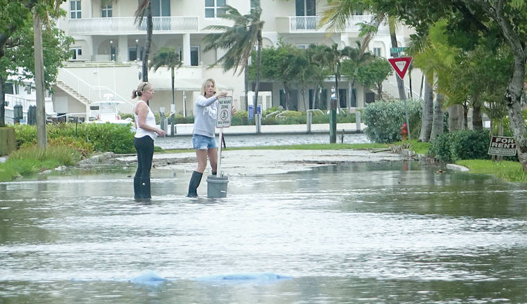 FILE - In this Oct. 5, 2017, file photo, residents move a “no wake,” sign through flood waters caused by king tides in Fort Lauderdale, Fla. Federal scientists, according to a report released Wednesday, July 10, 2019, predict 40 places in the U.S. will experience higher than normal rates of so-called sunny day flooding this year due to rising sea levels and an abnormal El Nino weather system. (Joe Cavaretta/South Florida Sun-Sentinel via AP)