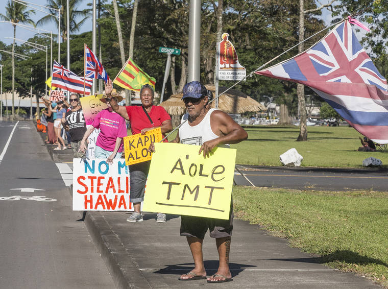 Opponents of the Thirty Meter Telescope wave signs Friday along Kamehameha Avenue near the King Kamehameha statue in Hilo.