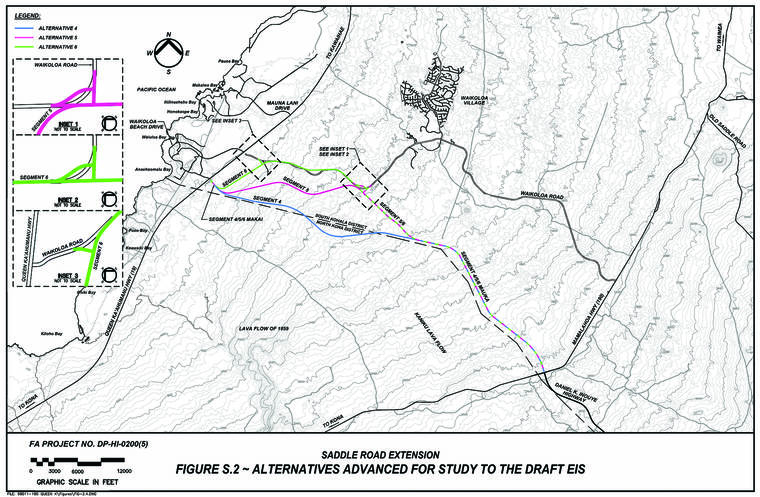 Under consideration are three potential routes to extend Daniel K. Inouye Highway from where it currently meets Mamalahoa Highway to the south intersection of Waikoloa Beach Drive and Queen Kaahumanu Highway. But each differs as to their exact alignments.