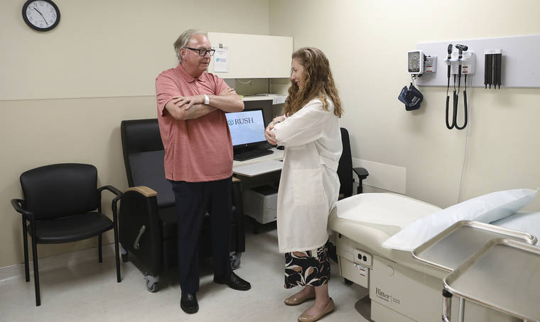 In this July 9, 2019 photo, Dr. Jori Fleisher, neurologist, examines Thomas Doyle, 66, at the Rush University Medical Center in Chicago. Doyle, 66, hopes blood tests may someday replace the invasive diagnostic testing he endured to be diagnosed 4.5 years ago with Lewy body dementia. (AP Photo/Teresa Crawford)