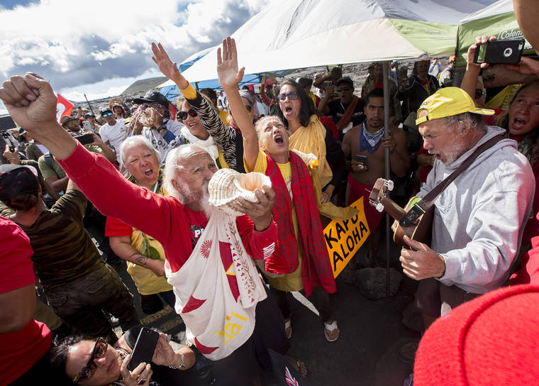 HOLLYN JOHNSON/Tribune-Herald Kupuna and other TMT opponents celebrate on the Maunakea Access Road after not getting arrested and reaching an agreement with law enforcement that no arrests would be made Tuesday, so long as approximately 20 workers on the mountain and police officers be allowed to leave.