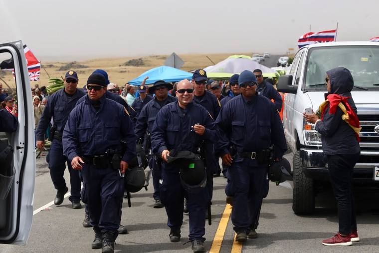 Several dozen Honolulu police officers, equipped with riot gear and batons, have lined the access road.