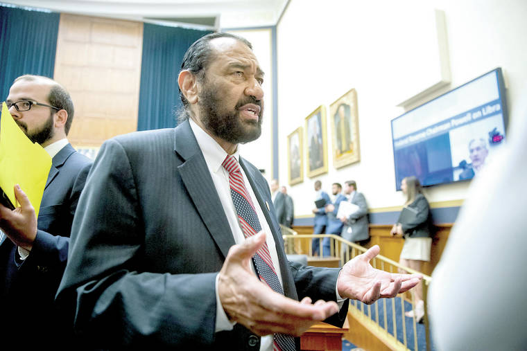 Rep. Al Green, D-Texas, right, speaks to visitors during a break from testimony from David Marcus, CEO of Facebook’s Calibra digital wallet service, before a House Financial Services Committee hearing on Facebook’s proposed cryptocurrency on Capitol Hill in Washington, Wednesday, July 17, 2019. Green has introduced a resolution in the House to impeach President Donald Trump. (AP Photo/Andrew Harnik)