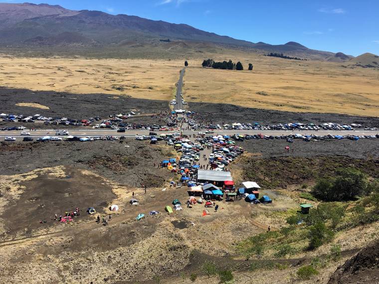 The Maunakea protest, as seen from Pu'u Huluhulu behind the protesters' camp.