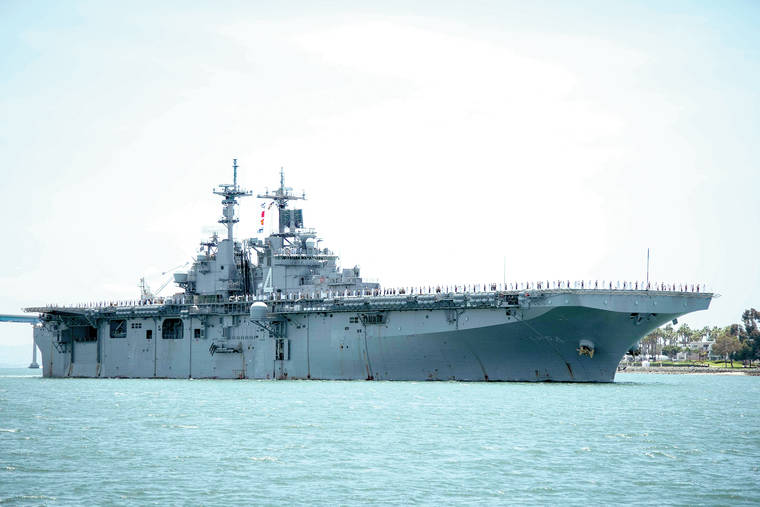 In this May 1, 2019, photo provided by the U.S. Navy, the amphibious assault ship USS Boxer (LHD 4) transits the San Diego Bay in San Diego, Calif. President Donald Trump says the USS Boxer destroyed an Iranian drone in the Strait of Hormuz amid heightened tensions between the two countries. Trump says it’s the latest “hostile” action by Iran. (Mass Communication Specialist 2nd Class Jesse Monford/U.S. Navy via AP)