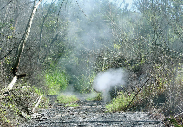 Although lava is no longer erupting, residual heat and small amounts of gas continue to escape from ground cracks and vents as subsurface molten rock, perhaps only several hundred feet underground, continues to cool.