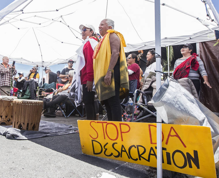 Among visitors to the protest site on the access road Saturday was Hawaii County Mayor Harry Kim, whose presence was generally a quiet one. Clad in a blue aloha shirt with a ti leaf lei, Kim sat quietly in a lawn chair and took in activities, which included chanting, music and hula. He made his way to the kupuna tent and exchanged hugs with some of the project opponents, including longtime Native Hawaiian activist Walter Ritte Jr. of Molokai.
