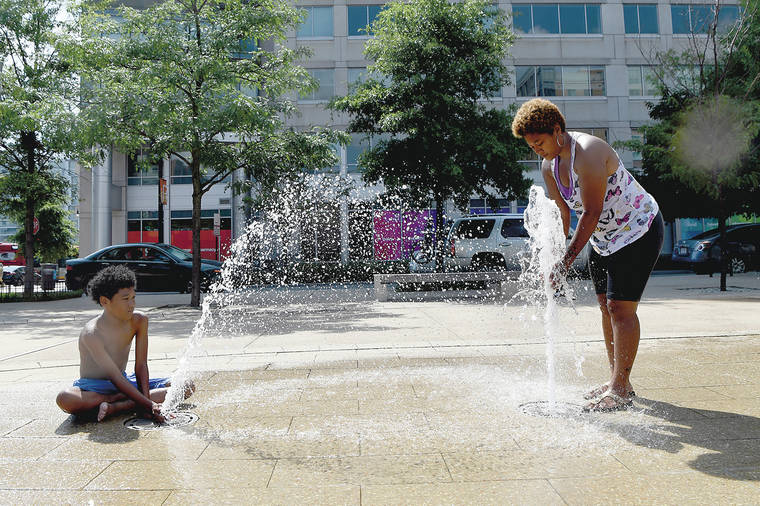 Karen Frazier of Capitol Heights, Md., right, and her son Amari Rogers, 11, left, play in a fountain Saturday in Washington. (AP Photo/Susan Walsh)