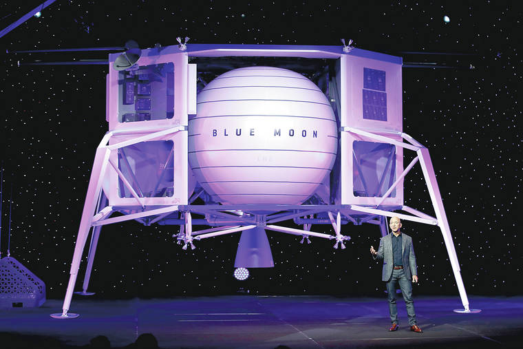 In this May 9 file photo, Jeff Bezos speaks in front of a model of Blue Origin's Blue Moon lunar lander in Washington. (AP Photo/Patrick Semansky, File)