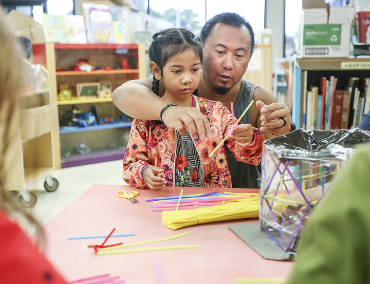 Michael Datuin helps his daughter, Lucky, 6, build a round structure with some straws and pipe cleaners while making a space dome craft June 22 at Hilo Public Library.