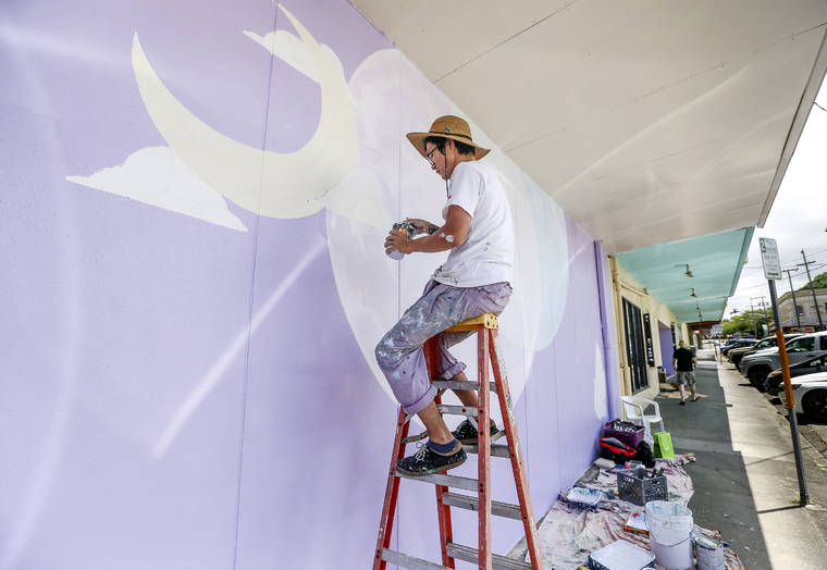 Artist Yoskay Yamamoto works June 21 to finish a mural he painted during his summer residency in Hilo with the Temple Children. The mural is located on Kalakaua Street in downtown Hilo.